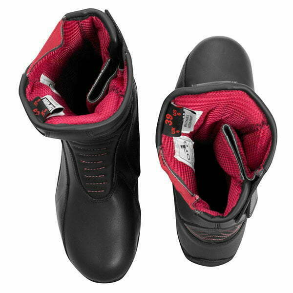 Sally Lady, ženski škorenj iz visoko tehničnega materiala, nepremočljiv in zračen, nudi idealno udobje pri vožnji. Zahvaljujoč prisotnosti stranske zadrge, zaščitene s trakom, ki jo je mogoče pritrditi na škorenj s priročnim zapiranjem na ježka, je prileganje udobno. Peta je ojačana in spremlja golen, prav tako je dodatno ojačana in anatomsko oblikovana, obogatena z mehkim notranjim oblazinjenjem. Konica je zaobljena in ojačana. Podplat ima diferencirano zarezano tekalno površino, ki zagotavlja visok protizdrsni učinek na stopalkah. Na notranji strani je nameščen termoformiran vložek za lažjo zaščito gležnja.